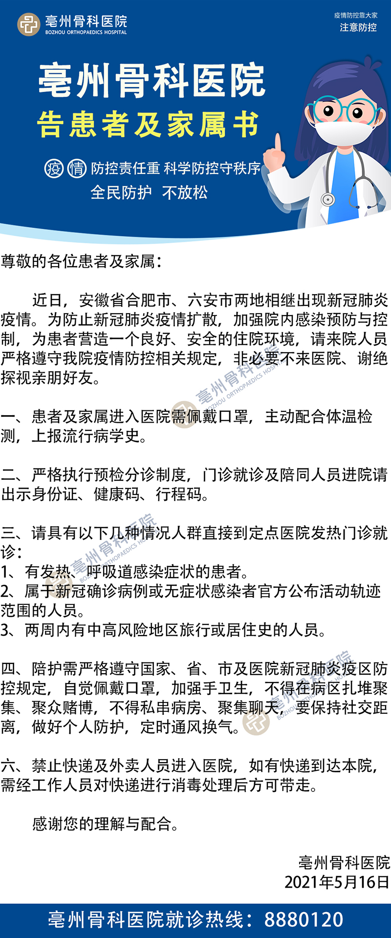 每周六、周日,亳州骨科醫(yī)院特聘省內(nèi)(蚌埠醫(yī)學(xué)院)知名專家:周建生教授、肖玉周教授、官建中教授、吳敏教授親臨我院長期坐診、查房、預(yù)約手術(shù)等。