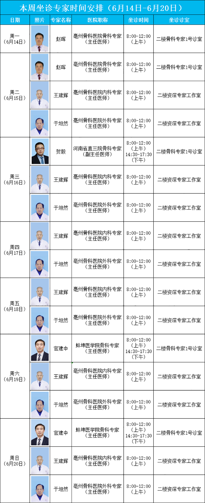 每周二至周日上午(8:00-12:00)亳州骨科醫(yī)院內(nèi)科專(zhuān)家王建輝,外科專(zhuān)家于坦然在門(mén)診樓二樓“資深專(zhuān)家工作室”坐診。