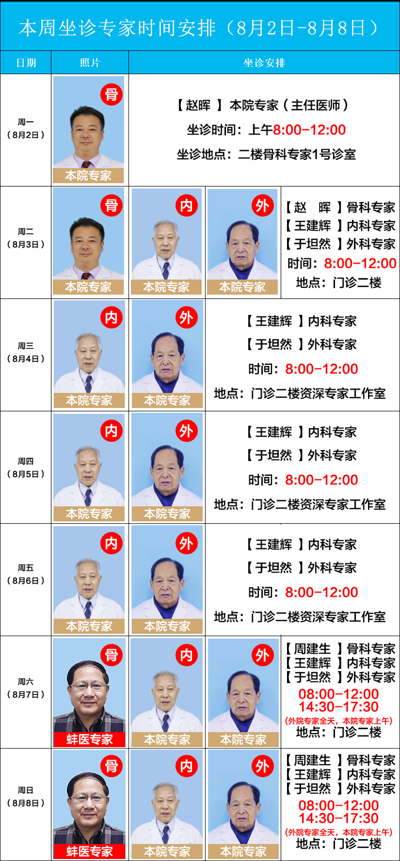 每周六、周日,亳州骨科醫(yī)院特聘省內(nèi)(蚌埠醫(yī)學(xué)院)知名專家:周建生教授、肖玉周教授、官建中教授、吳敏教授親臨我院長期坐診、查房、預(yù)約手術(shù)等。