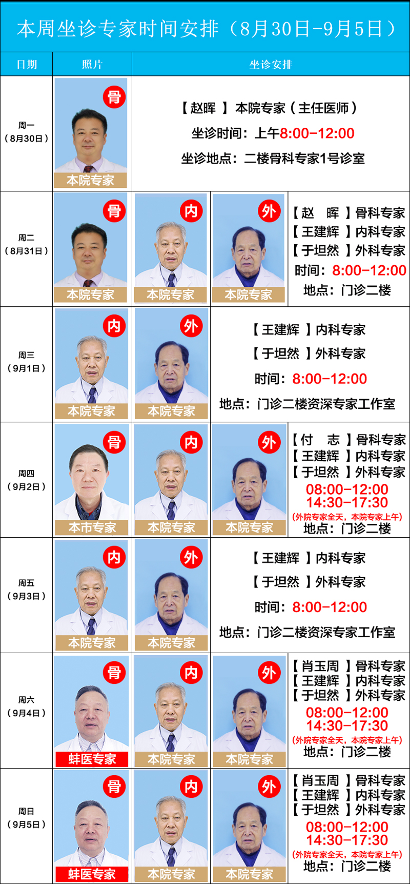 每周六、周日,亳州骨科醫(yī)院特聘省內(nèi)(蚌埠醫(yī)學(xué)院)知名專家:周建生教授、肖玉周教授、官建中教授、吳敏教授親臨我院長期坐診、查房、預(yù)約手術(shù)等。