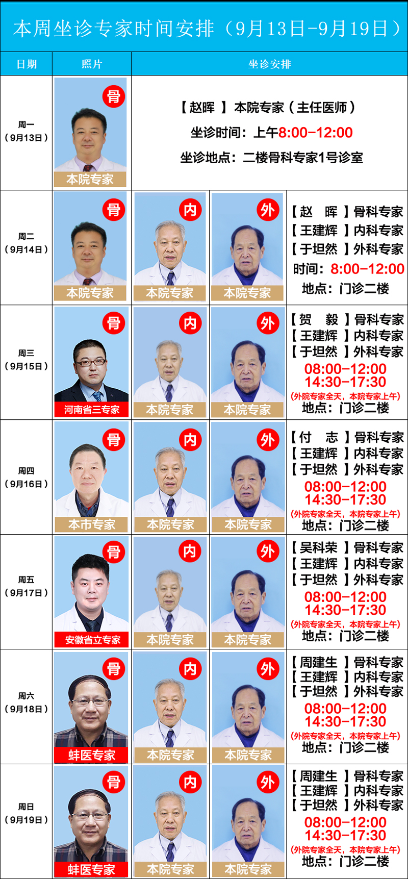 每周六、周日,亳州骨科醫(yī)院特聘省內(nèi)(蚌埠醫(yī)學(xué)院)知名專家:周建生教授、肖玉周教授、官建中教授、吳敏教授親臨我院長期坐診、查房、預(yù)約手術(shù)等。