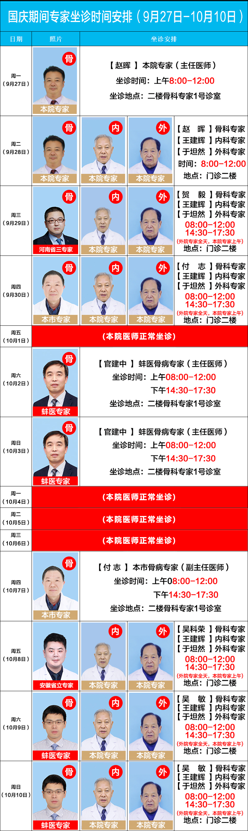 每周六、周日,亳州骨科醫(yī)院特聘省內(nèi)(蚌埠醫(yī)學(xué)院)知名專(zhuān)家:周建生教授、肖玉周教授、官建中教授、吳敏教授親臨我院長(zhǎng)期坐診、查房、預(yù)約手術(shù)等。