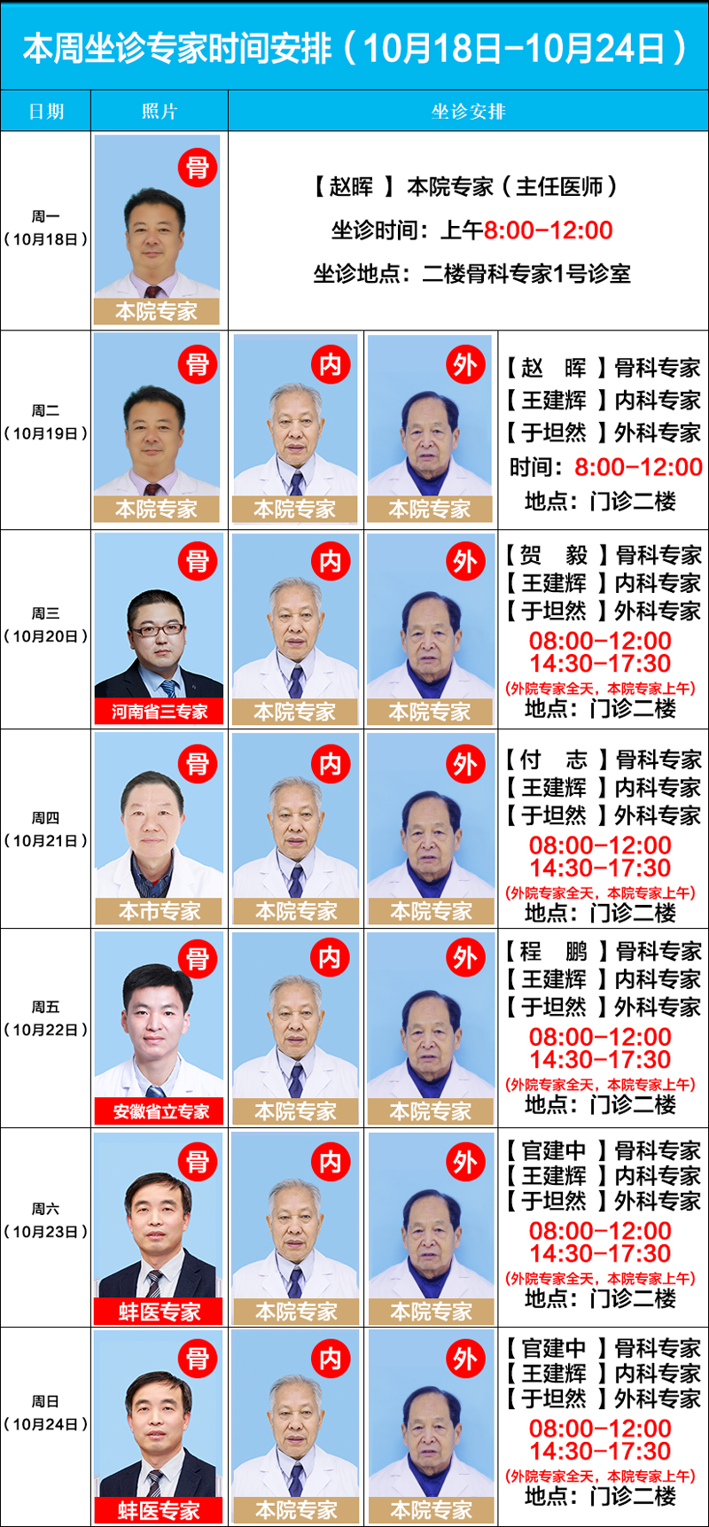 每周六、周日,亳州骨科醫(yī)院特聘省內(nèi)(蚌埠醫(yī)學(xué)院)知名專家:周建生教授、肖玉周教授、官建中教授、吳敏教授親臨我院長期坐診、查房、預(yù)約手術(shù)等。
