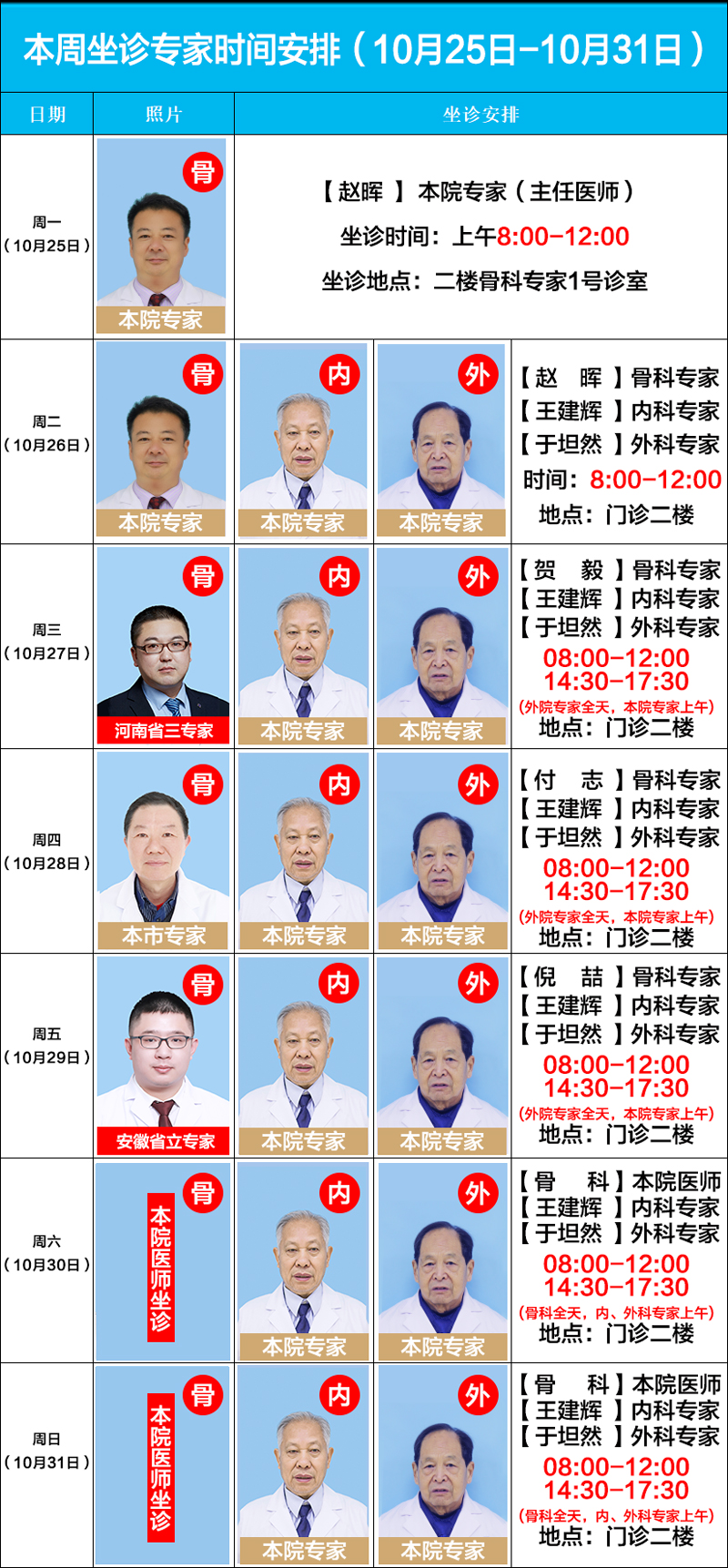 每周六、周日,亳州骨科醫(yī)院特聘省內(nèi)(蚌埠醫(yī)學(xué)院)知名專家:周建生教授、肖玉周教授、官建中教授、吳敏教授親臨我院長(zhǎng)期坐診、查房、預(yù)約手術(shù)等。