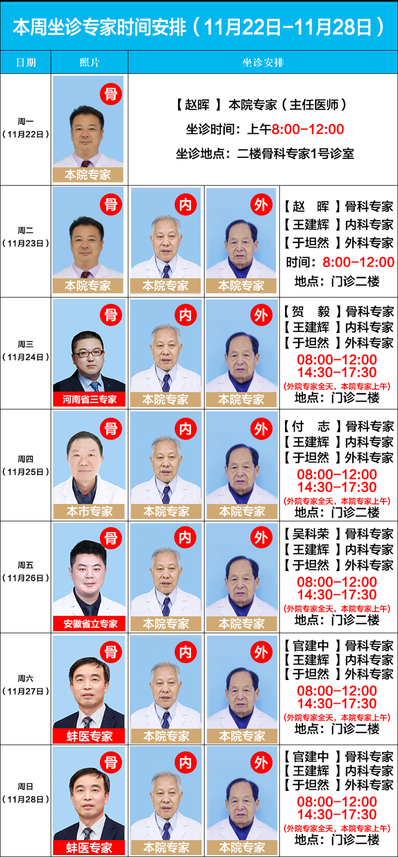 每周六、周日,亳州骨科醫(yī)院特聘省內(nèi)(蚌埠醫(yī)學(xué)院)知名專家:周建生教授、肖玉周教授、官建中教授、吳敏教授親臨我院長期坐診、查房、預(yù)約手術(shù)等。