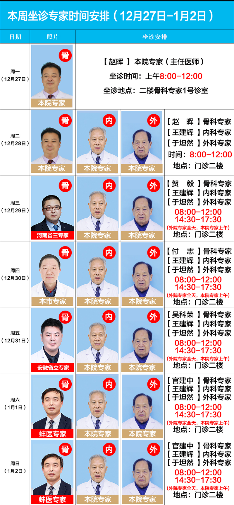 每周六、周日,亳州骨科醫(yī)院特聘省內(nèi)(蚌埠醫(yī)學(xué)院)知名專家:周建生教授、肖玉周教授、官建中教授、吳敏教授親臨我院長期坐診、查房、預(yù)約手術(shù)等。