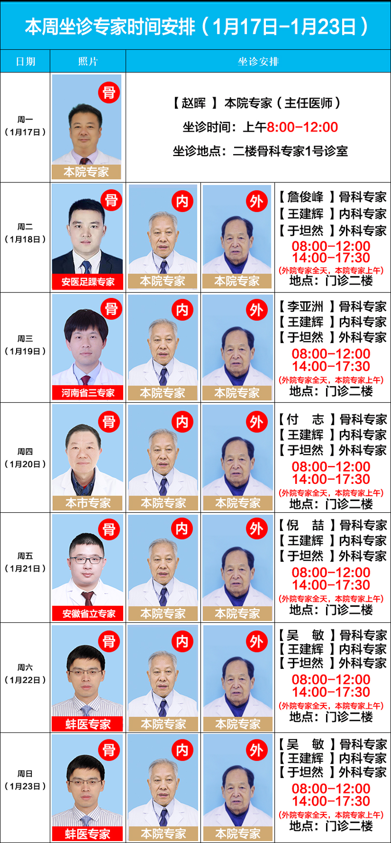 每周六、周日,亳州骨科醫(yī)院特聘省內(nèi)(蚌埠醫(yī)學(xué)院)知名專家:周建生教授、肖玉周教授、官建中教授、吳敏教授親臨我院長(zhǎng)期坐診、查房、預(yù)約手術(shù)等。