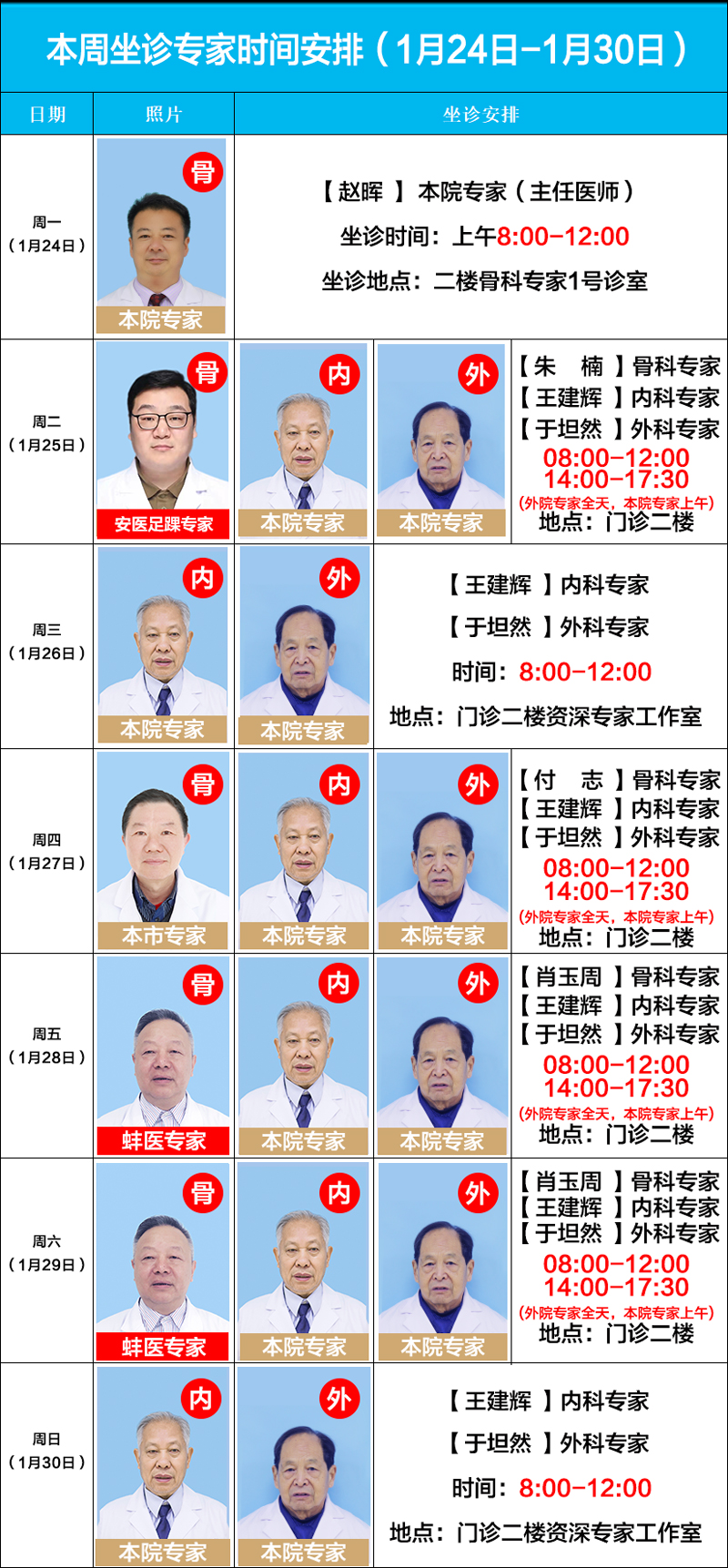 每周六、周日,亳州骨科醫(yī)院特聘省內(nèi)(蚌埠醫(yī)學(xué)院)知名專家:周建生教授、肖玉周教授、官建中教授、吳敏教授親臨我院長(zhǎng)期坐診、查房、預(yù)約手術(shù)等。