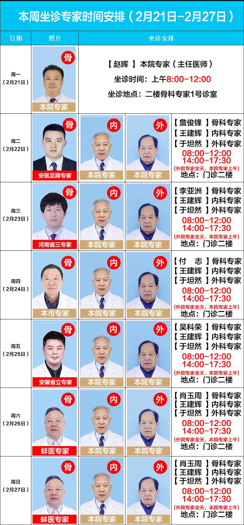 每周六、周日,亳州骨科醫(yī)院特聘省內(nèi)(蚌埠醫(yī)學(xué)院)知名專家:周建生教授、肖玉周教授、官建中教授、吳敏教授親臨我院長期坐診、查房、預(yù)約手術(shù)等。