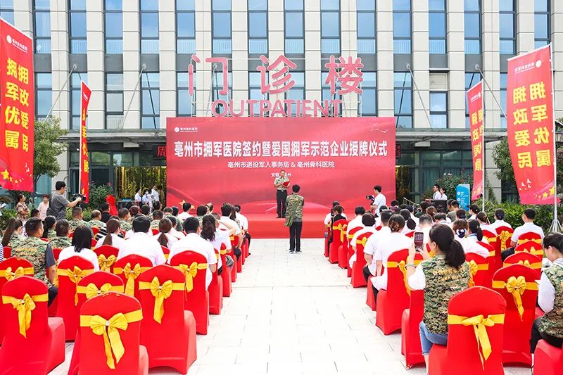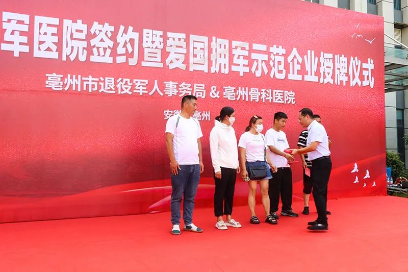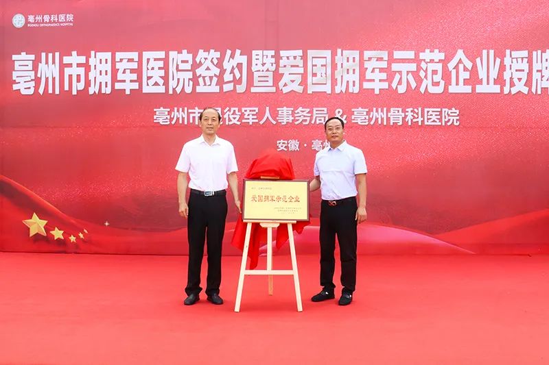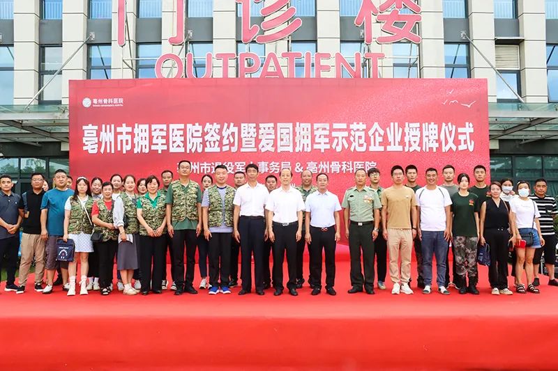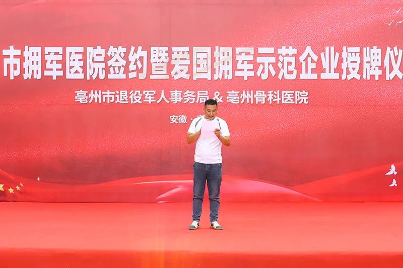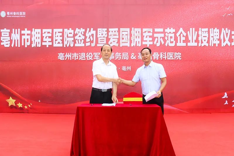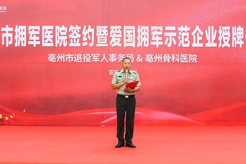 為進(jìn)一步弘揚(yáng)“擁政愛民、擁軍優(yōu)屬”優(yōu)良傳統(tǒng),持續(xù)推進(jìn)雙擁共建社會化的工作目標(biāo),不斷鞏固和發(fā)展軍政軍民團(tuán)結(jié),營造軍愛民,民擁軍的濃厚氛圍,培育在全社會形成“讓軍人成為全社會尊崇的職業(yè)”的鮮明社會價(jià)值導(dǎo)向,2023年8月1日,“亳州市擁軍醫(yī)院簽約暨愛國擁軍示范企業(yè)授牌儀式”在亳州骨科醫(yī)院盛大舉行,亳州市退役軍人事務(wù)局副局長趙傳璽、譙城區(qū)退役軍人事務(wù)局副局長李厚福、高新區(qū)社會事務(wù)局工作人員陳寧、亳州市擁軍協(xié)會會長李祥林、亳州骨科醫(yī)院董事長常永光以及邊海防官兵家庭和退役軍人代表出席簽約儀式。
