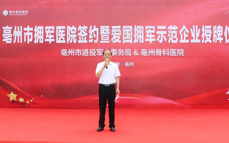 市退役軍人事務(wù)局趙傳璽副局長授予亳州骨科醫(yī)院“愛國擁軍示范企業(yè)”稱號,并高度贊揚(yáng)亳州骨科醫(yī)院的雙擁共建工作,感謝醫(yī)院為退役軍人提供的優(yōu)質(zhì)服務(wù)、精心的治療和深切的關(guān)懷,希望醫(yī)院越來越好。