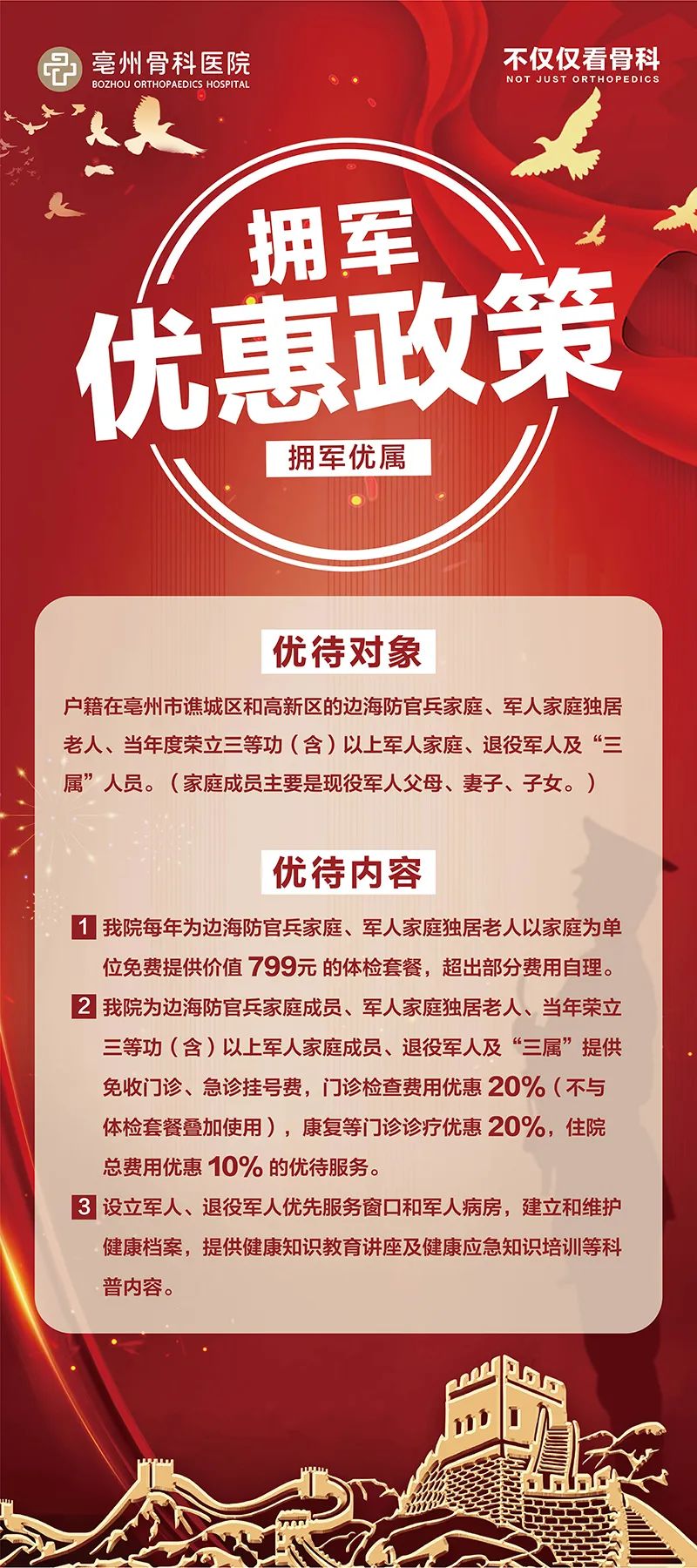 本次擁軍醫(yī)院簽約,是遵循國家和社會相結(jié)合的工作方針,秉持體現(xiàn)尊崇、激勵(lì)的政策導(dǎo)向,推進(jìn)社會化擁軍優(yōu)撫工作的重要方式,也是落實(shí)優(yōu)待政策、惠及退役軍人的實(shí)際舉措。亳州骨科醫(yī)院推出擁軍特惠政策,每年為邊海防官兵家庭、軍人家庭獨(dú)居老人以家庭為單位免費(fèi)提供體驗(yàn)套餐,并為邊海防官兵家庭、軍人家庭獨(dú)居老人、以及當(dāng)年榮立三等功(含)以上軍人家庭成員、退役軍人及“三屬”提供免收門診、急診掛號費(fèi),給予門診檢查、康復(fù)等門診診療、住院總費(fèi)用優(yōu)惠等優(yōu)待服務(wù)。同時(shí),醫(yī)院還設(shè)立軍人、退役軍人優(yōu)先服務(wù)窗口和軍人病房,建立和維護(hù)健康檔案,提供健康知識教育講座及健康應(yīng)急知識培訓(xùn)等科普內(nèi)容。