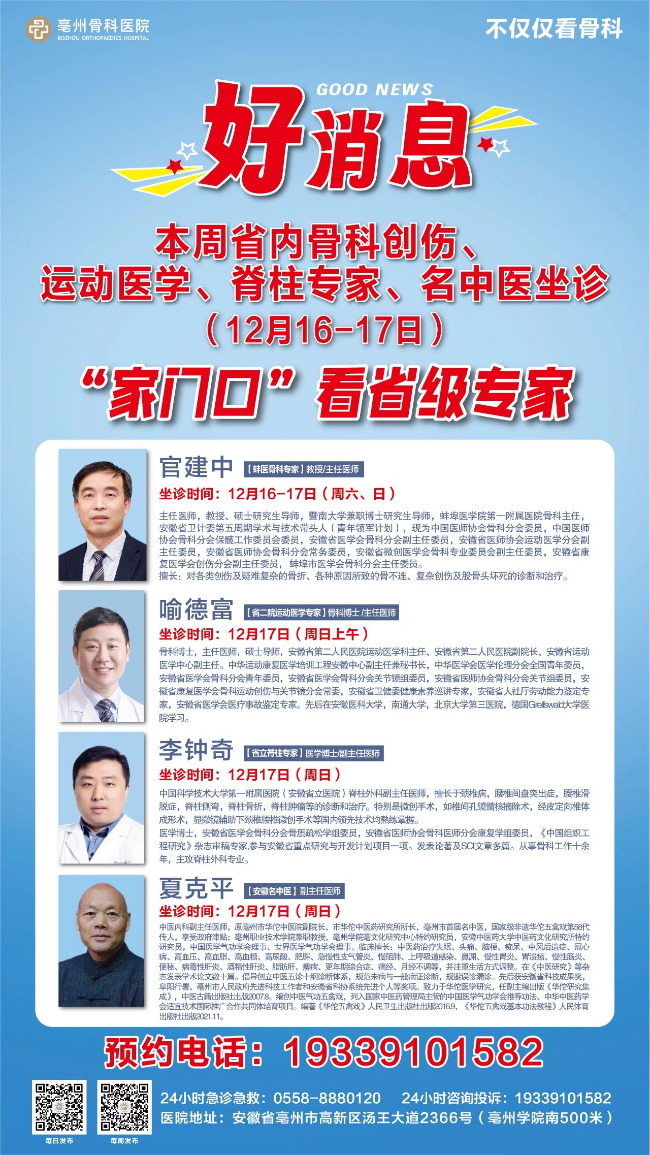 24小時(shí)急診急救電話:0558-8880120 24小時(shí)咨詢(xún)投訴:19339101582 普惠體檢中心:0558-5520830