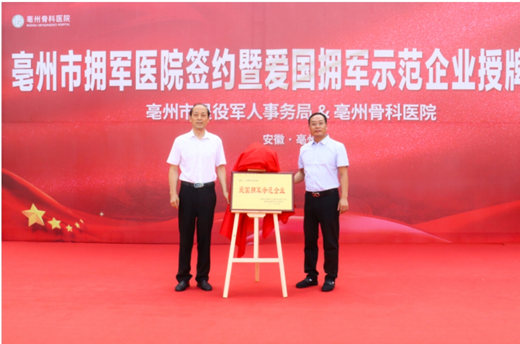 2023年8月1日,亳州骨科醫(yī)院榮為“亳州市擁軍醫(yī)院暨愛國(guó)擁軍示范企業(yè)”,并授牌。