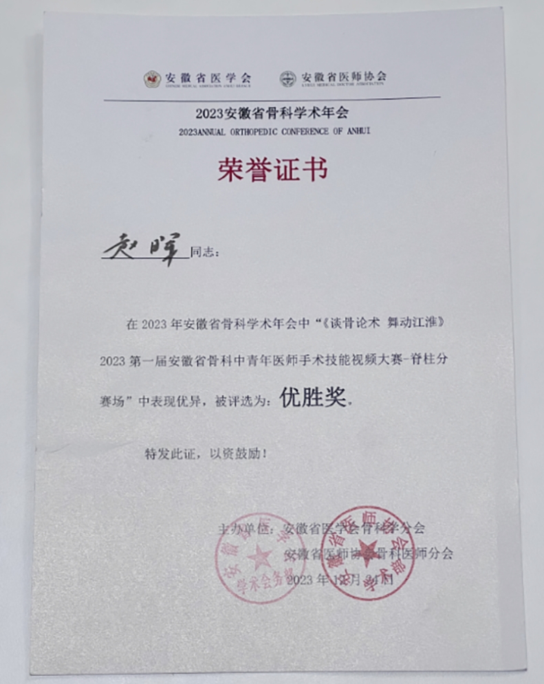 2023年12月24日,亳州骨科醫(yī)院脊柱、足踝外科團(tuán)隊(duì)在“安徽省骨科年會(huì)脊柱大賽中榮獲優(yōu)勝獎(jiǎng)”。
