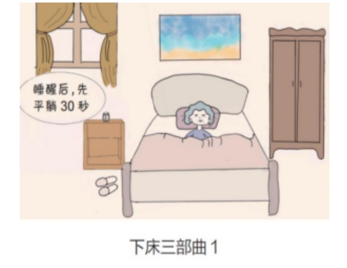 4.高危險人群學(xué)會起床三部曲。睡醒后先平躺30秒;床上靜坐30秒;床邊再坐30秒后緩慢起身。