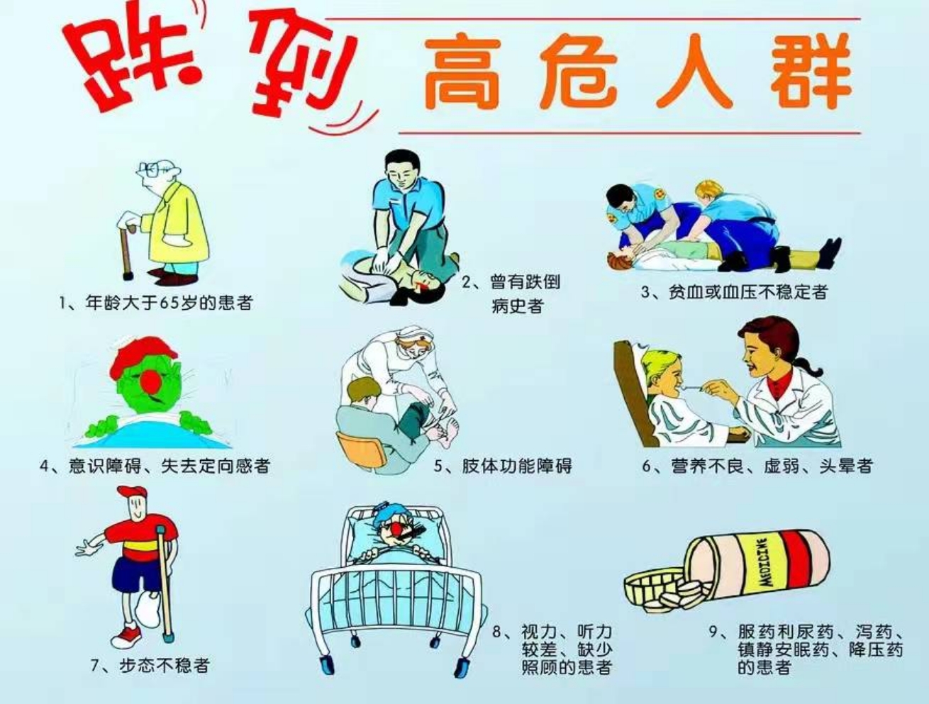 為了防止患者在住院時發(fā)生跌倒,入院時護士會向您介紹病區(qū)環(huán)境以及注意事項,請各位患者及家屬牢記,其中關(guān)于預(yù)防跌倒的內(nèi)容有以下幾點: