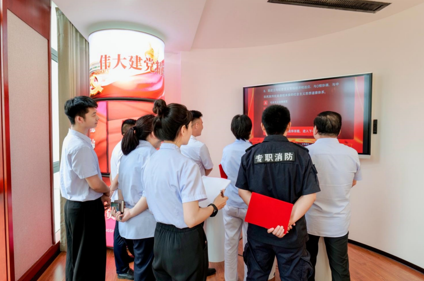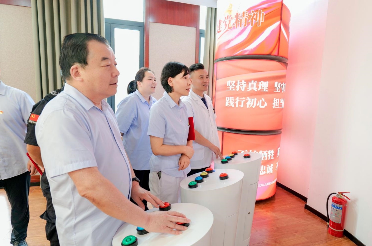 答題在新建成的黨性教育體驗(yàn)館數(shù)字大屏答題區(qū)進(jìn)行,題庫(kù)主要有黨的二十大報(bào)告、黨章、黨風(fēng)黨紀(jì)、習(xí)近平新時(shí)代中國(guó)特色社會(huì)主義思想、主題教育、醫(yī)務(wù)知識(shí)等。