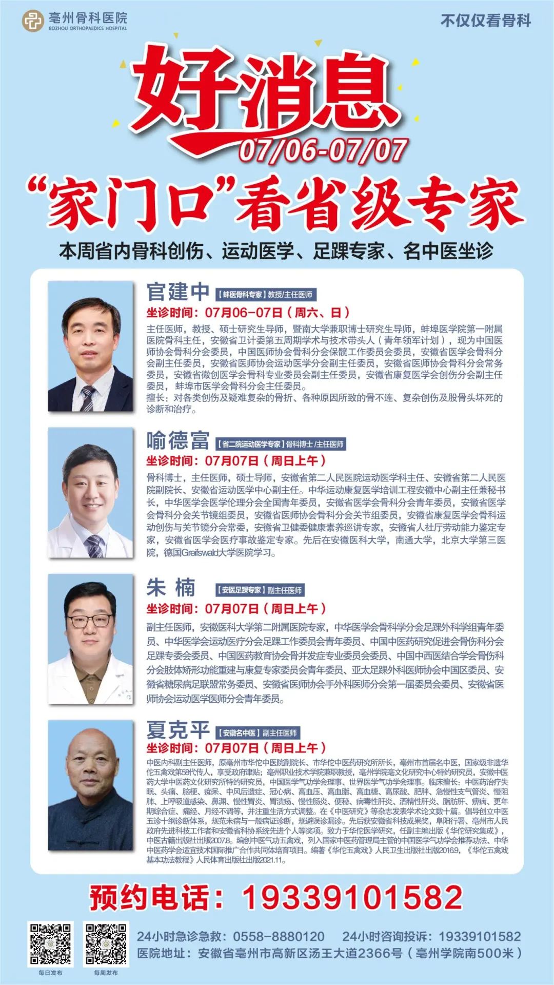 他們將以權(quán)威專業(yè)的醫(yī)術(shù),為廣大患者提供精準的診療服務(wù)。無論您是深受骨傷困擾,或是有運動損傷疑慮,抑或足踝問題久治不愈,把握良機,讓專家為您的健康保駕護航,重煥活力人生!