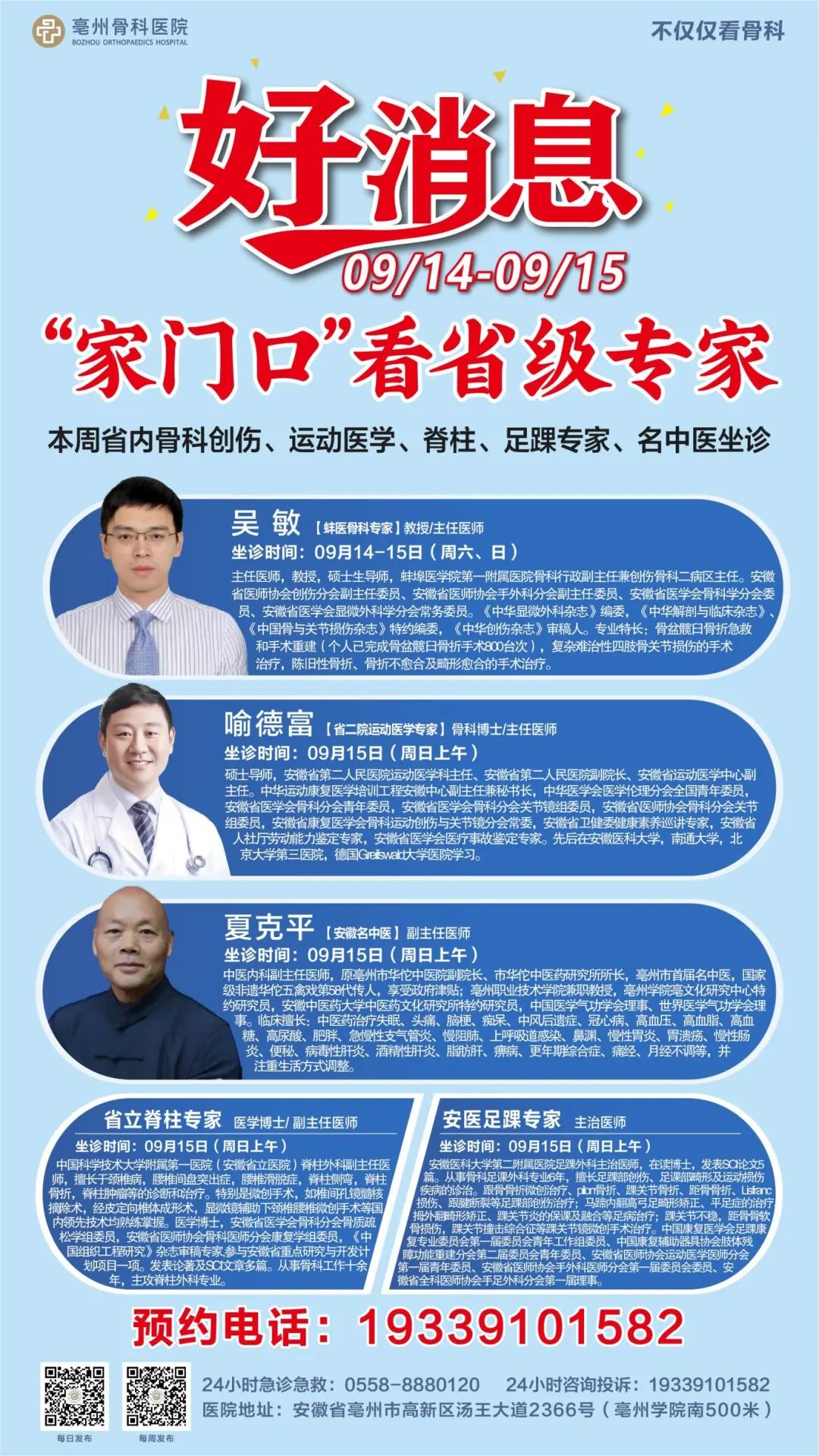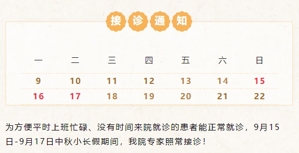 為方便平時上班忙碌、沒有時間來院就診的患者能正常就診,9月15日-9月17日中秋小長假期間,我院專家照常接診!