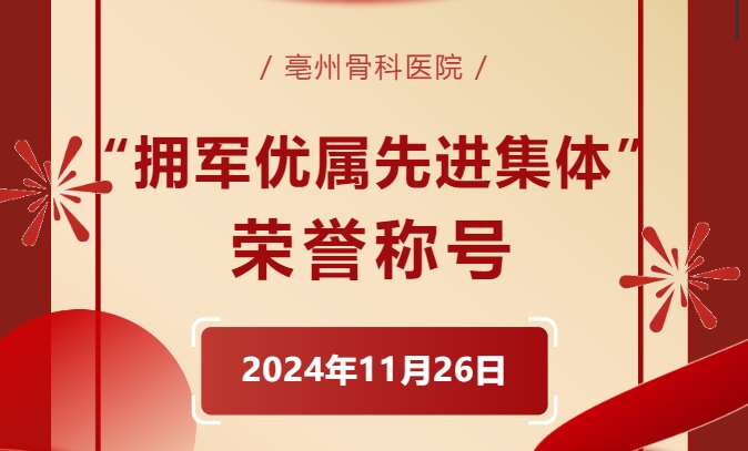 2024年11月26日,亳州骨科醫(yī)院榮獲由中共亳州市委退役軍人事務(wù)工作領(lǐng)導(dǎo)小組辦公室授予的“擁軍優(yōu)屬先進(jìn)集體”榮譽(yù)稱號。這份榮譽(yù)是對醫(yī)院長期以來積極履行社會責(zé)任,扎實(shí)開展雙擁工作的充分肯定和高度褒獎。