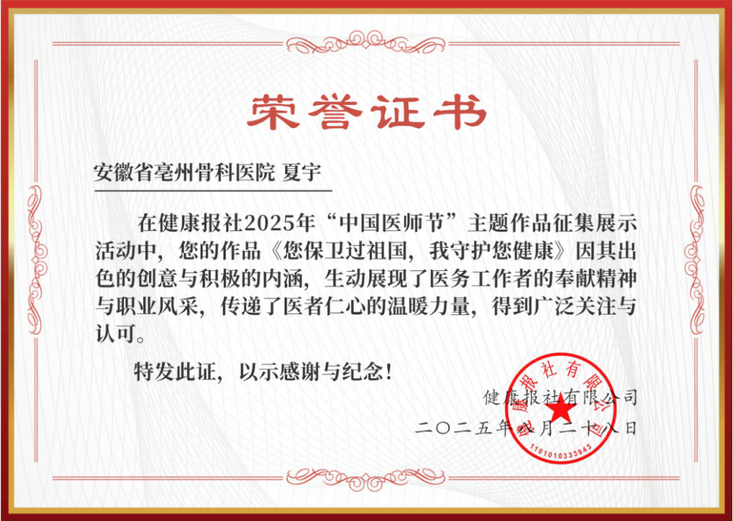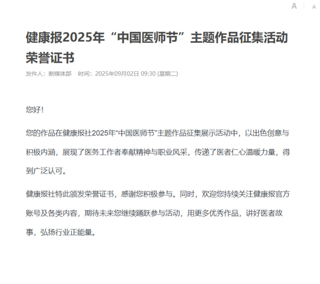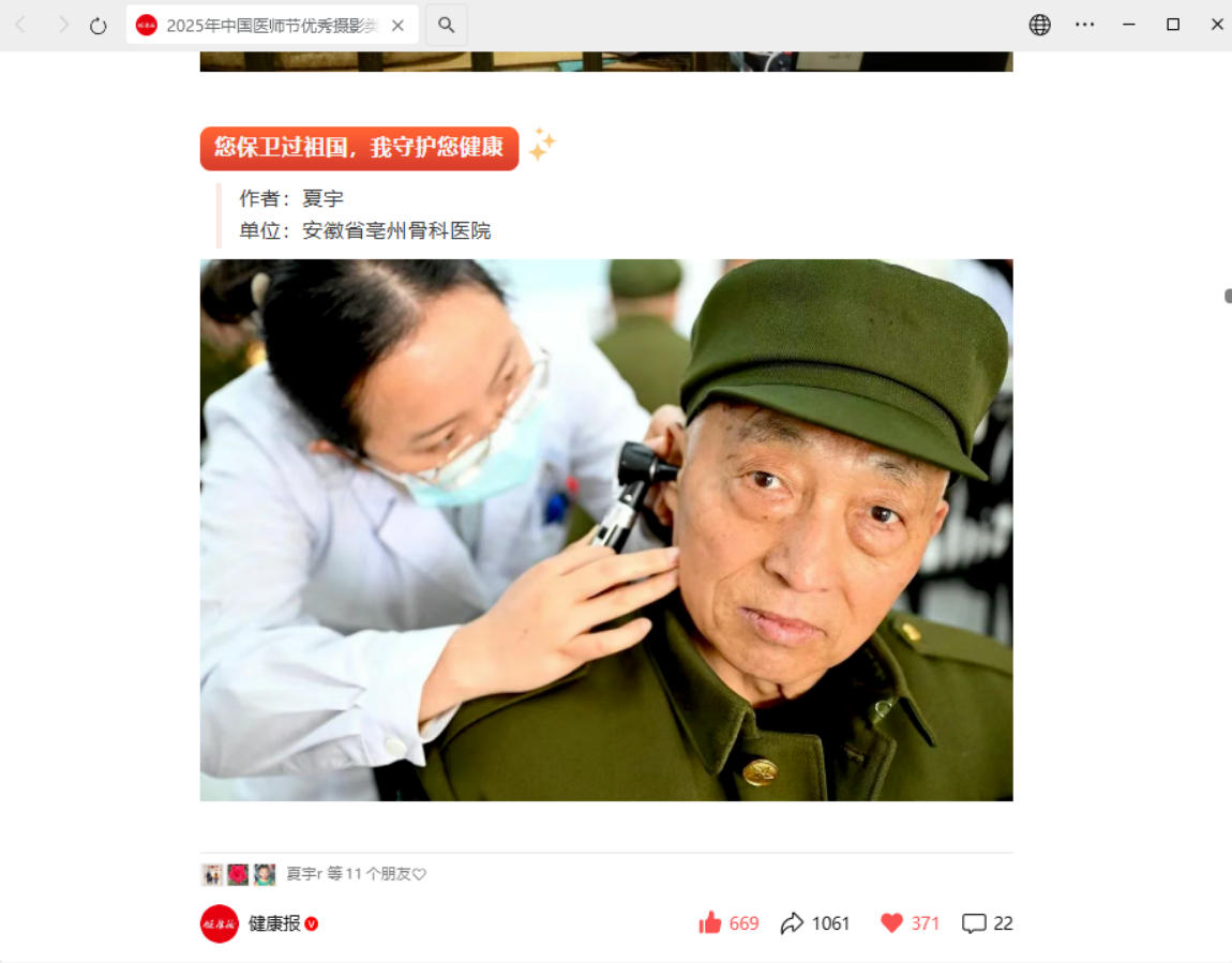 我院再傳喜訊:由事業(yè)發(fā)展部投稿的攝影作品《您保衛(wèi)過祖國,我守護(hù)您健康》,成功入選《健康報(bào)》2025年中國醫(yī)師節(jié)優(yōu)秀攝影類作品展播,并獲得榮譽(yù)證書。