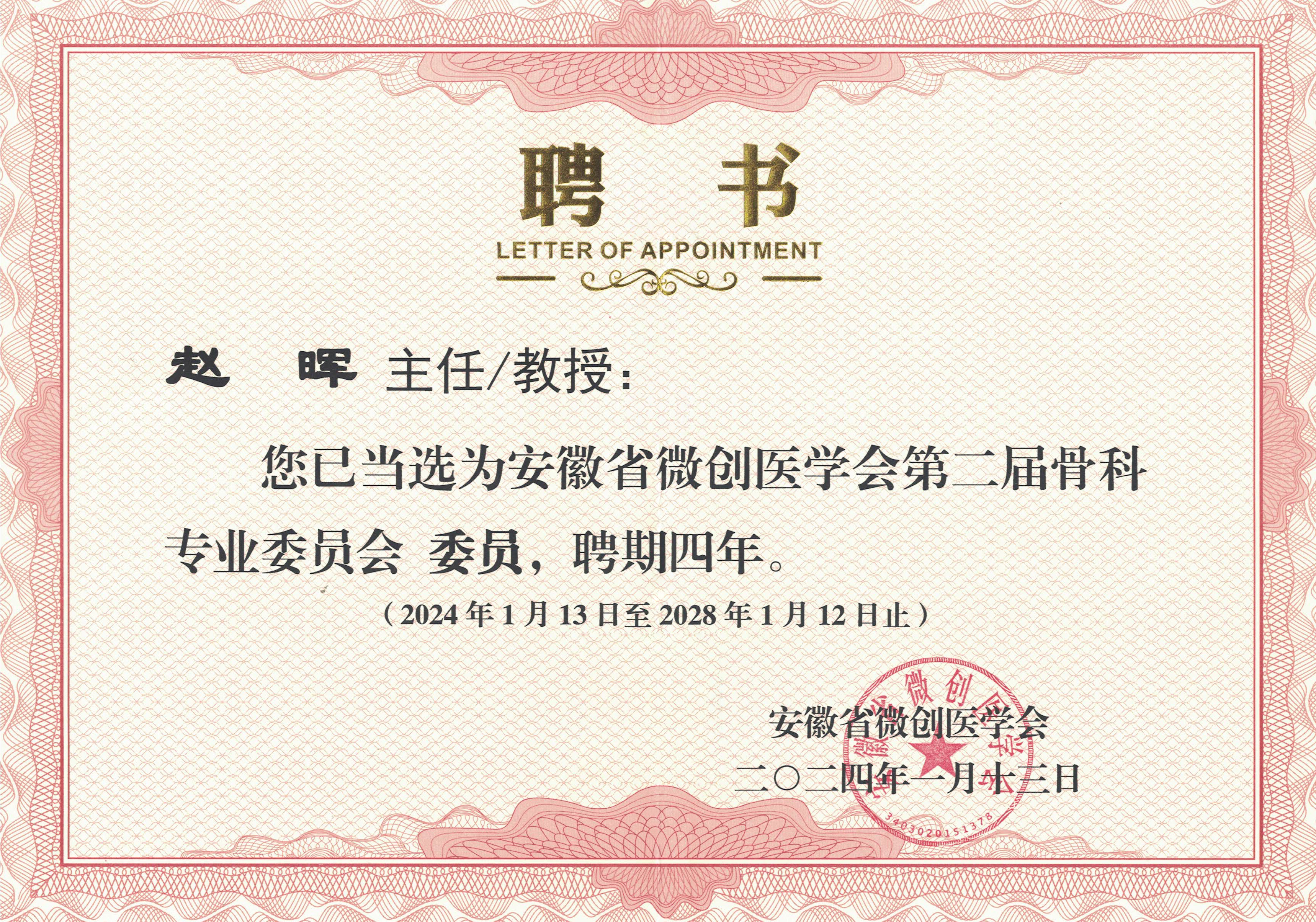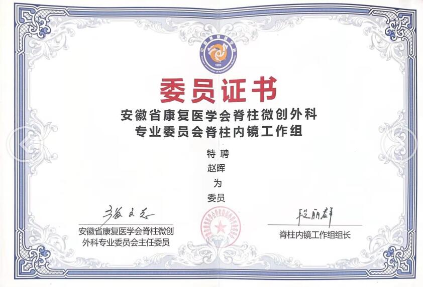 安徽省康復(fù)醫(yī)學(xué)會(huì)脊柱微創(chuàng)外科專業(yè)委員會(huì)脊柱內(nèi)鏡工作組特聘趙暉為委員,頒發(fā)委員證書