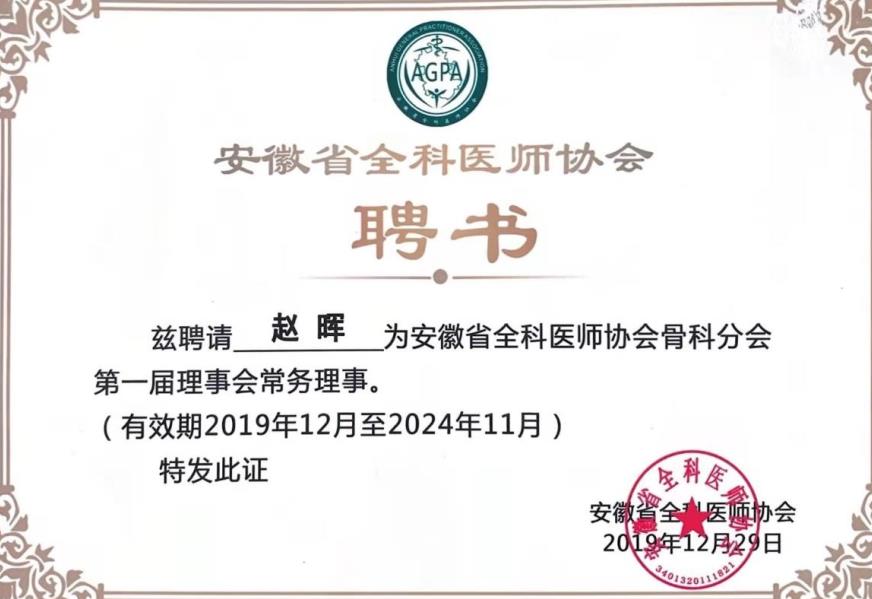 安徽省全科醫(yī)師協(xié)會(huì)2019年12月29聘請(qǐng)趙暉為安徽省全科醫(yī)師協(xié)會(huì)骨科分會(huì)第一屆理事會(huì)常務(wù)理事。(有效期2019年12月至2024年11月)