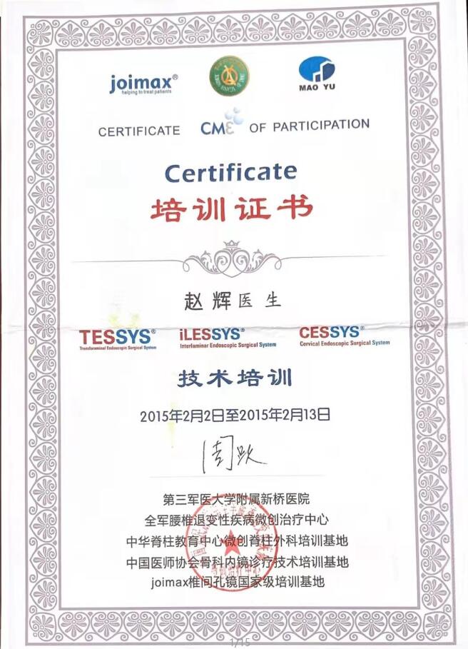 2015年2月2日至2015年2月13日趙輝醫(yī)生獲得第三軍醫(yī)大學(xué)附屬新橋醫(yī)院、全軍腰椎退變性疾病微創(chuàng)治療中心、中華脊柱教育中心微創(chuàng)脊柱外科培訓(xùn)基地、中國醫(yī)師協(xié)會(huì)骨科內(nèi)鏡診療技術(shù)培訓(xùn)基地、joimax椎間孔鏡國家級(jí)培訓(xùn)基地聯(lián)合頒發(fā)的技術(shù)培訓(xùn)證書