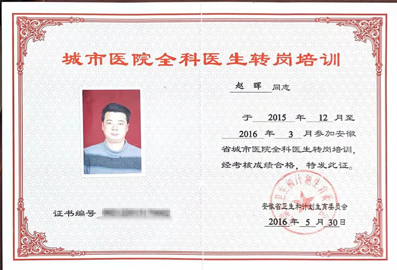 城市醫(yī)院全科醫(yī)生轉(zhuǎn)崗培訓(xùn)證書趙暉同志于2015年12月至2016年03月參加安徽省城市醫(yī)院全科醫(yī)生轉(zhuǎn)崗培訓(xùn),經(jīng)考核成績合格。