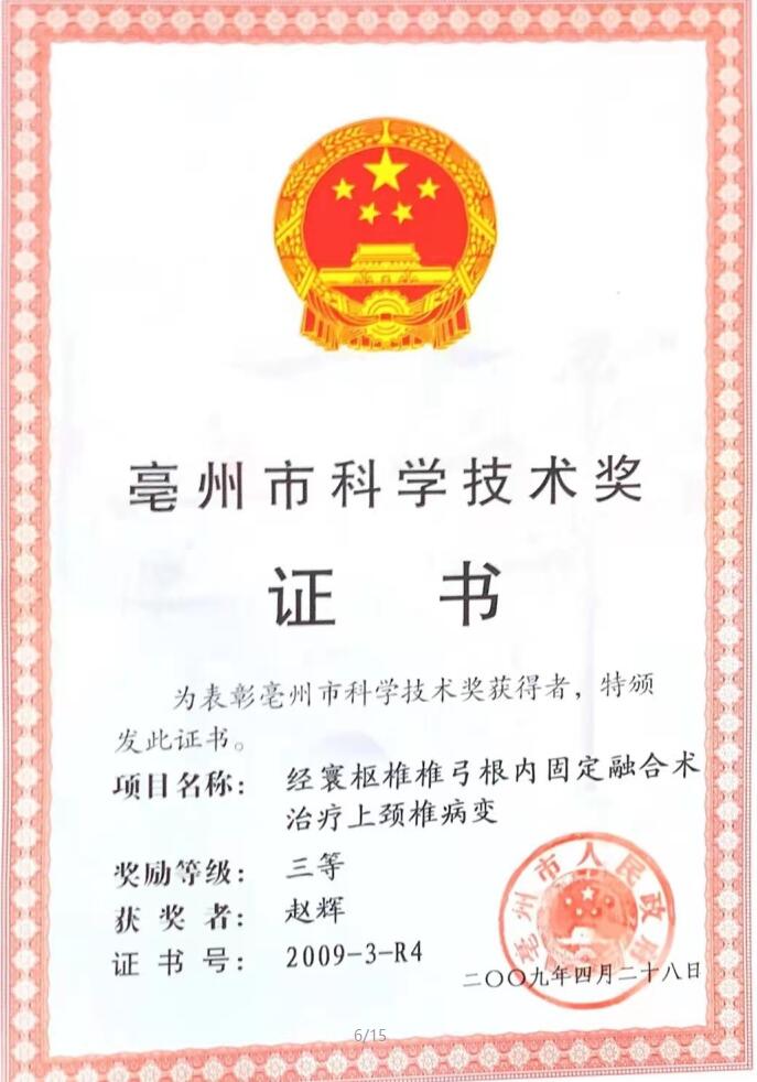 2008年12月趙輝同志參加研制的經(jīng)寰樞椎椎弓根內(nèi)固定融合術(shù)治療上頸椎病變項(xiàng)目己取得成功,經(jīng)審查符合市級(jí)科技成果條件。亳州市科學(xué)技術(shù)局