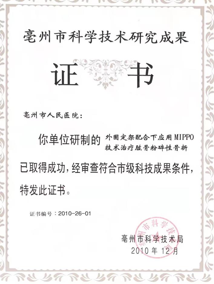 亳州市人民醫(yī)院:你單位研制的外固定架配合下應(yīng)用MIPPO技術(shù)治療肱骨粉碎性骨折已取得成功,經(jīng)審查符合市級(jí)科技成果條件,特發(fā)此證書。
